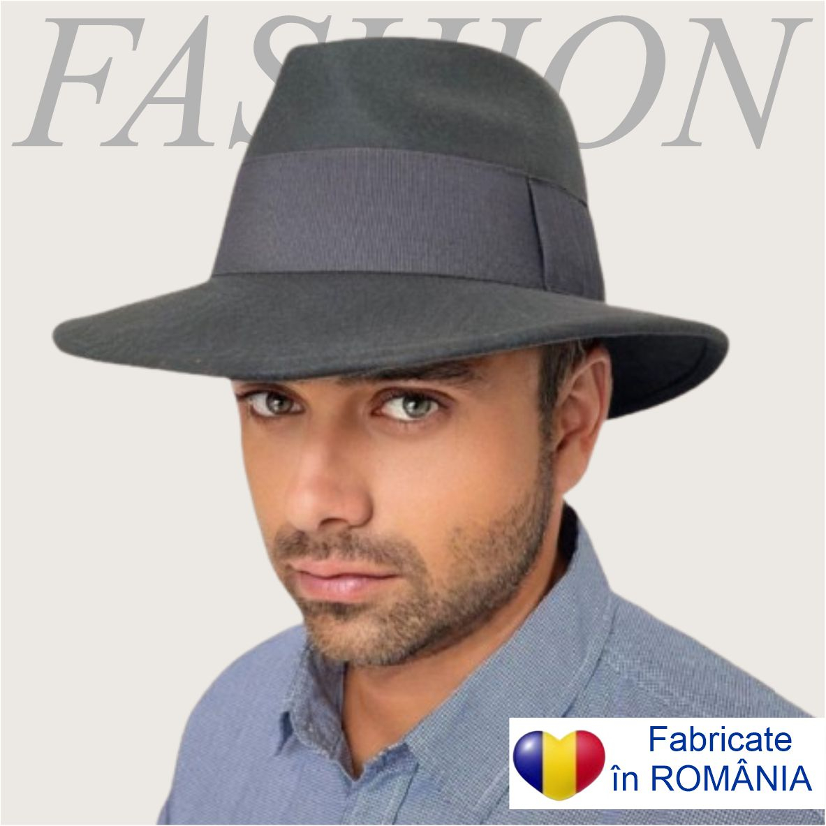 Fabricate in ROMANIA Si tu te poti bucura de o palarie moderna si de calitate alegand noul modelul Italian Style, o palarie de un GRI distins, din fetru italian de calitate lux, cu boruri mari in stil italian, usor lasate in jos si panglica lata luxurianta cu cute laterale si un nou design, la moda acum - marimi de la 53 la 60