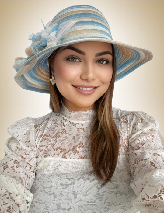 Palarie de soare de lux din organza satinata VENETIA CHIC (ALBASTRU+CREM) - marime unica, reglabila