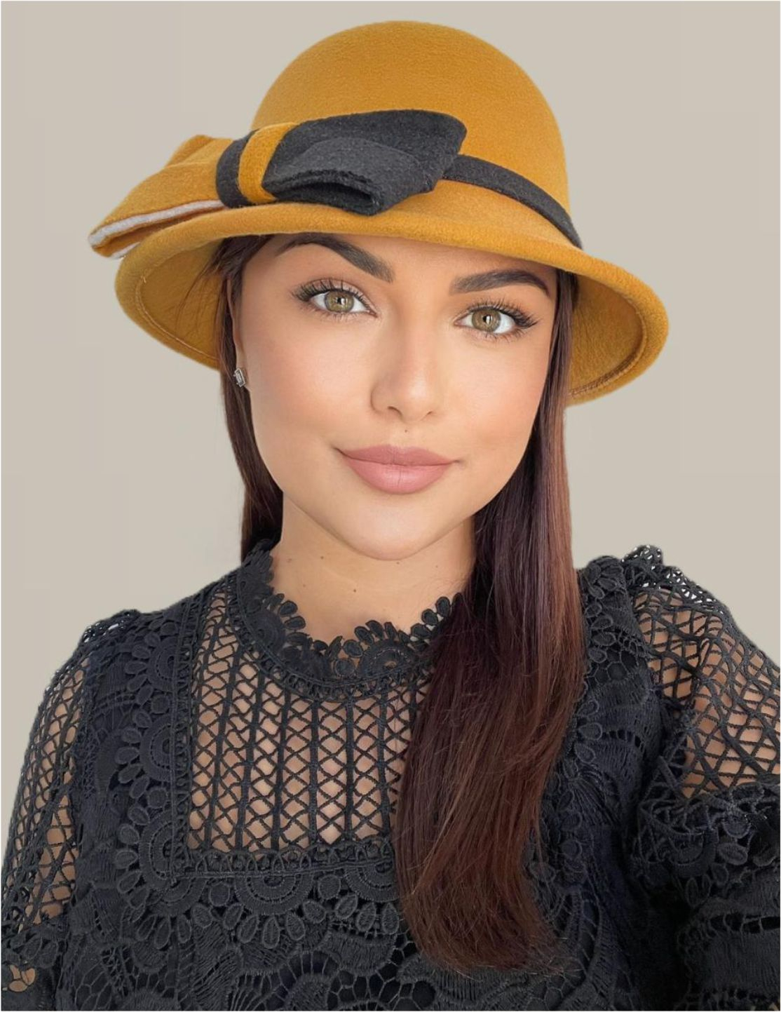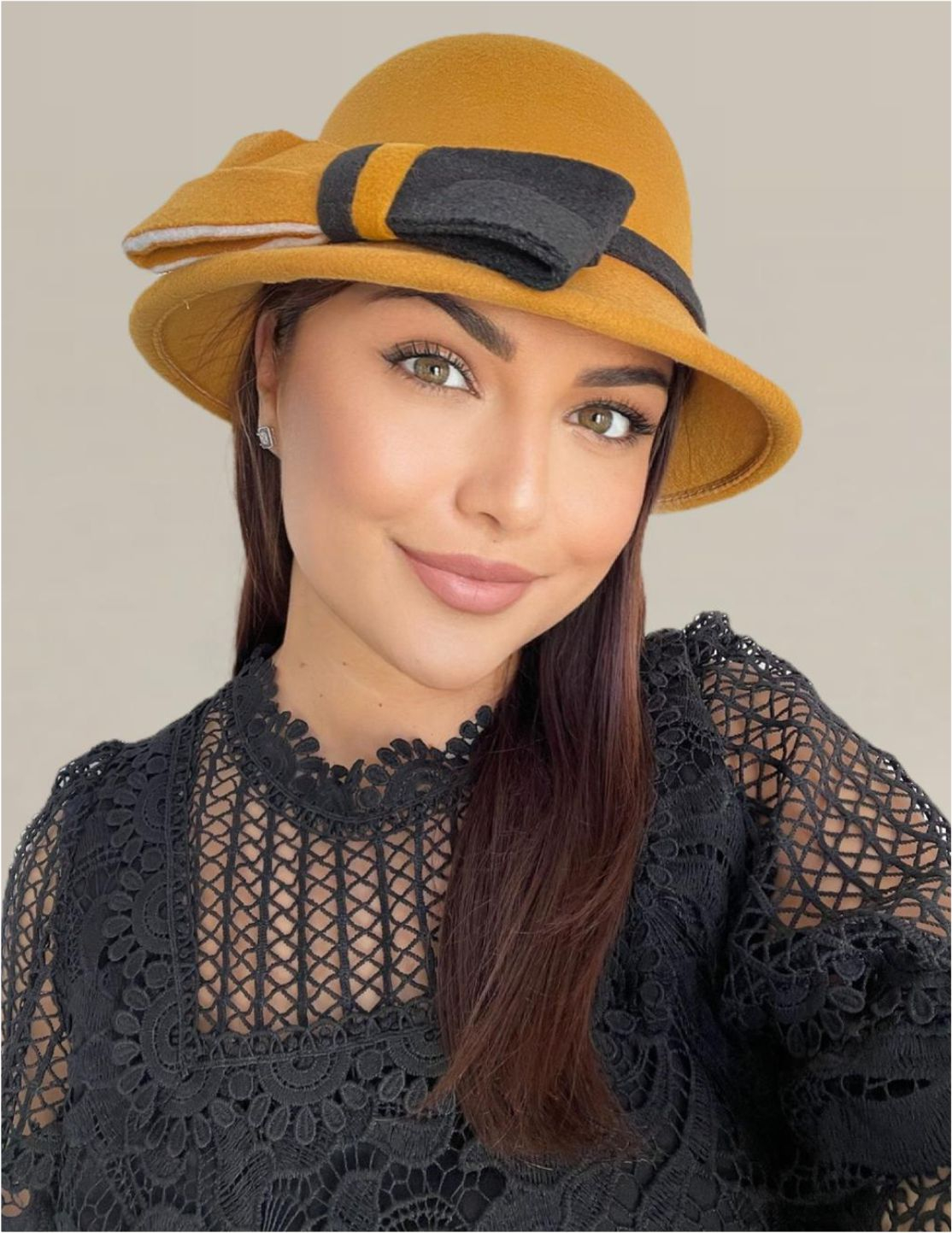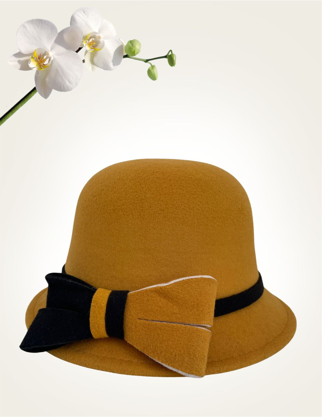 • MODEL: palarie eleganta rotunda cu boruri mici si accesoriu funda in 2 culori (boruri de ± 5 cm)