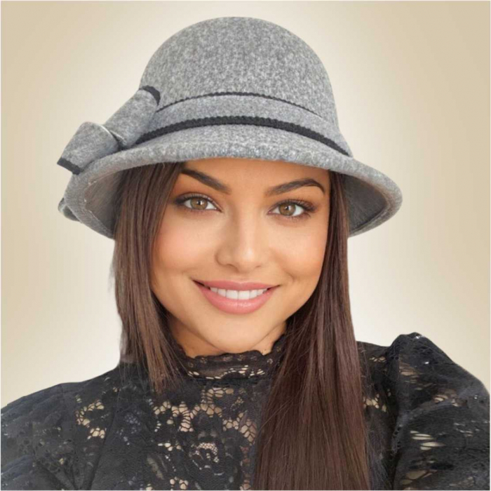 Si tu te poti bucura de o palarie moderna si de calitate alegand noul model de palarie Miss Aliss, o palarie deosebit de stilata, in GRI distins, cu boruri rotunde, mici si delicate, usor lasate in jos și decor rafinat cu funda brodata cu negru pe la margini, un accesoriu deosebit de elegant ce va da o nota aparte de rafinament tinutelor tale de fiecare zi - marime unica, reglabila