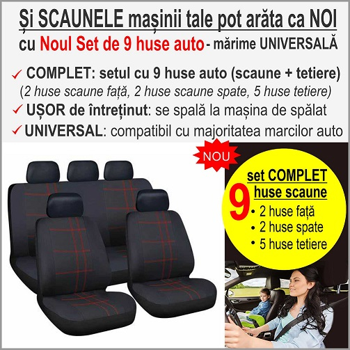 Si masina ta poate arata ca noua la interior si poate avea scaune mai curate, mai confortabile si mai moi cu Noul Set complet de 9 huse scaune auto din material textil usor elastic (ce permite montarea usoara si mularea huselor pe scaun) si captuseala confortabila din spuma subtire de burete - marime UNIVERSALA (pentru masini de 5 locuri)