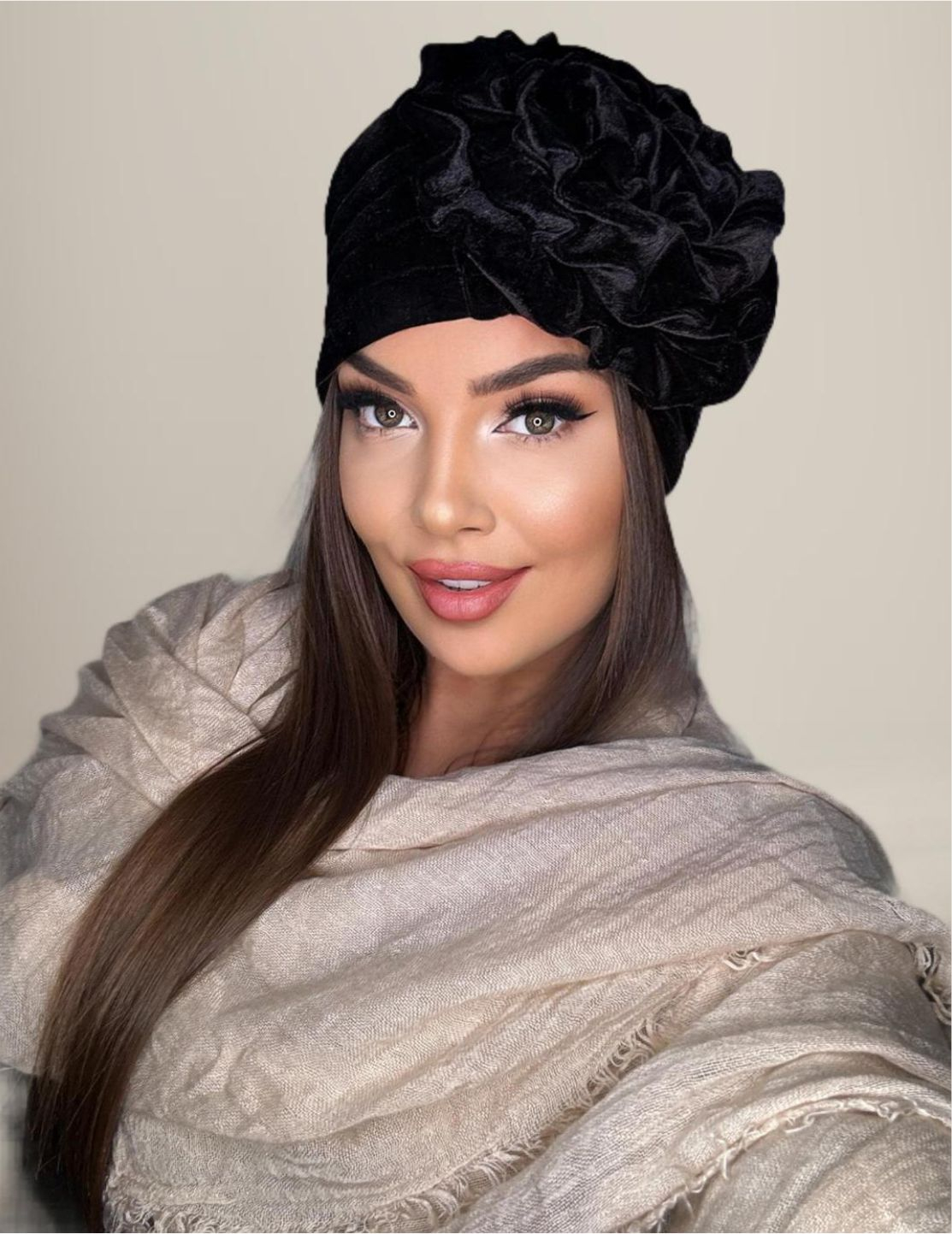 Fabricate in ROMANIA Si tu te poti bucura de un turban de calitate, elegant si la moda acum, alegand modelul Afrodita, un model de un NEGRU distins, din catifea de calitate premium, cu falduri elegante de jur imprejur, elegant decor floral si captuseala calduroasa la interior si un nou design, mai elegant ca oricand - marime UNIVERSALA